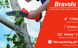 Mini Chainsaw, Bravolu 21V 6-inch Cordless Electric Chainsaw, One-Handed Portable Battery Chainsaw with 2*1.5AH Batteries and 2 Chains, Suitable for Pruning Trees and Branches Wood Cutting