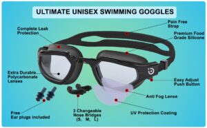 BZAIN Adult Swimming Goggles for Men and Women, No-leak, Anti-fog, UV-Protection, Adult Mens Swimming Goggles with Free Ear Plugs & 3 Nose Bridges