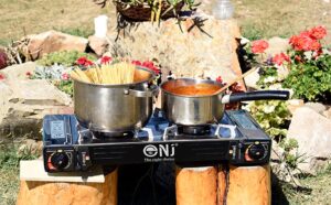 NJ SG-2S Camping Gas Stove – Double Burner Portable Butane Twin Cooker Outdoor Camp Kitchen Auto Ignition Stainless Steel Compact Plastic Carry Case and Bag