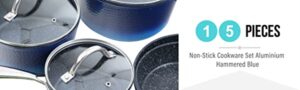 Kitchen Academy 15 Pieces Non-Stick Cookware Set, Nonstick Induction Granite-Coated Pot Pan Set, Includes Lids, Frying and Pans Accessories – Aluminium Hammered Blue