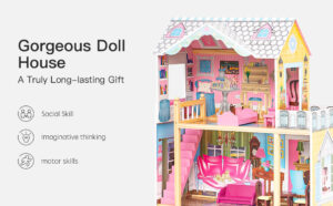 Milliard Wooden Dolls House, Large Three Level Dollhouse for Kids – Includes 20 Furniture Pieces