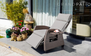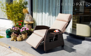 Grand patio Recliner PE Wicker, Adjustable Position Height Armchair with Flip Table and Cushion, Aluminum Frame, Lounge Chair for Indoor, Outdoor (Brown Wicker, Beige Cushion)
