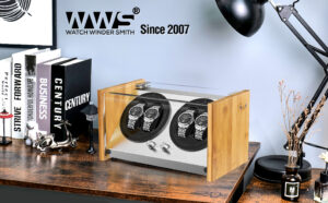 Watch Winder Box for Automatic Watches or Compatible with Couple Size Double, Craftsmanship 100% Bamboo Wood Patent Housing Case, ACor Battery Powered Super Quiet Japanese Motor by Watch Winder Smith®