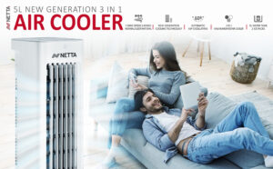 NETTA 3 In 1 Air Cooler with Remote Control, Fan and Humidifier Settings, LED Display, 3 Fan Speeds and 3 Modes, Oscillation Function, 7 Hour Timer, 2 Ice Packs, 55W