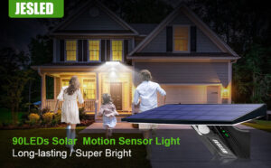 Solar Lights Outdoor, JESLED 90 LED Solar Motion Sensor Security Lights Solar Powered Lights Waterproof 2600mAh, USB Charging, Solar Wall Lights Outside for Garden Fence Door Yard Pathway (1 Pack) [Energy Class A+]