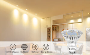 Key Features Significant Energy Savings These 3W LED bulbs are 35W halogen lamp equivalent and replacement, save you 90% energy. They can also last up to 15,000 hours, which will reduce the re-lamp frequency. Wide Beam Angle With 120 degree beam angle, these GU10 LED bulbs can cast a uniform flood light, suitable for general-purpose lighting. High Colour Rendering The colour rendering index (CRI) is over 80, which tends to make your objects reflecting colours truly, naturally and vividly. Itâs particularly suitable for both residential and commercial lighting. Wide Application Home Lighting Hallways, dining room, lounge, kitchen, bedroom, living room, kid’s room and more. Hotel Lighting Corridors, lobbies, stairwells, reception areas, guest rooms, display cases, cabinets, washrooms and more. Office Lighting Workplaces, conference or meeting rooms, hallways, display areas, entrance ways and more. Retail Lighting Exhibitions, display cabinets, dressing rooms, restaurants, bars, cafes, shop-windows and more. GU10 LED Bulbs, Warm White Perfect Halogen Replacement With the ordinary GU10 bi-pin base and similar shape design, these GU10 LED bulbs are ideal and long-lasting replacements for your mains voltage halogen lamps, they can be easily fitted to your existing light fixtures with GU10 holders. Safe for Your Family It contains no lead or mercury, no hazardous emissions, no UV or IR radiation, shockproof and vibration proof, very safe for your home and family. Elegant Warm White Lighting With a colour temperature of 2700k, these flicker-free and instant-on GU10 bulbs produce 250lm incandescent-like warm white lights, and create a cosy, relaxing and inviting atmosphere. Specifications 3 watts, 250 lumen GU10, 220-240V AC Warm White 2,700K 120° Beam Angle Non-dimmable Glass ø50mm x 53mm Pack of 10 Units Wattage 3W=35W 5W=50W 4W = 50W 4W = 50W 4W = 50W 5W = 50W Brightness 250 lumen 450 lumen 350 lumen 350 lumen 350 lumen 450 lumen Light Colour Warm White 2,700K Warm White 2,700K Warm White 2,700K Warm White 2,700K Daylight White 5,000K Daylight White 5,000K Beam Angle 120° 100° 36° 120° 120° 100° Size ø50*53mm ø50*58mm ø50*56mm ø50*53mm ø50*53mm ø50*58mm Material Glass Plastic Plastic Glass Glass Plastic Dimmable No No No No No No Voltage AC 220V-240V AC 220V-240V AC 220V-240V AC 220V-240V AC 220V-240V AC 220V-240V Check Offer Price Weight: 500 g Dimensions: 5 x 5 x 5.3 cm; 500 Grams Brand: LE Model: 200080-WW-EU-10-c Part: 200059-WW-EU-10 Colour: Warm White Pack Quantity: 10 Batteries Required: No Batteries Included: No Manufacture: LE Colour: Warm White Quantity: 10