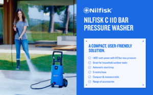 Nilfisk C 110 bar 110.7-5 PC X-TRA Compact Pressure Washer for Basic Tasks Outdoor Cleaner with Patio Cleaning Accessory Kit, 1400 W, 240 V, Blue, 440 L/H Water Flow