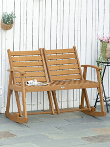 Outsunny Wooden Garden Rocking Bench with Adjustable Backrests, 2-Seater Rustic Rocking Chair Loveseat with Slatted Seat and Armrests