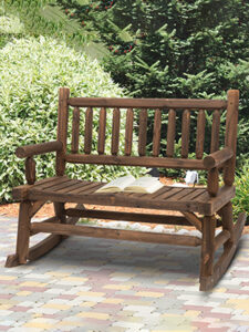 Outsunny Garden 2-Seater Rocking Bench Wood Frame Rough-Cut Log Loveseat Slatted High Back Rustic Style with Armrests Garden Outdoor Furniture – Dark Stain Brow