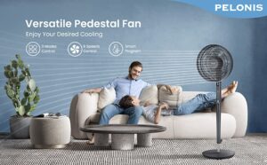 PELONIS 16-Inch Pedestal Fan 90° Tiltable Head Up, 120° Oscilliation, Smart Temperature Optimization, Quiet DC Motor 19W Low Energy, 9-Speed 8H Timer, Air Cooling with Remote Control for Bedroom