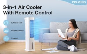 PELONIS Air Cooler, Tower Fan & Humidifier with 60° Oscillation, 7H Timer, 3-in-1 Evaporative Air Cooler with 3 Speed Settings, 3 Mode Settings, 5L Water Tank, Remote Control for Home & Office