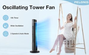 PELONIS Tower Fan with Remote Control, Bladeless Black Quiet Oscillating 90° Fan, Tall Standing Fan 40-inch, 4 Speeds, 3 Wind Modes & LED Display, 15h Timer, Memory Functio