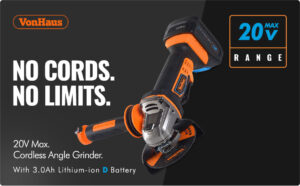 VonHaus Cordless Angle Grinder with 3.0Ah Li-ion 20V MAX Battery, Charger, 1 x 115mm / 4 ½” Cutting Disc & Power Tool Bag – Includes Anti Vibration Support Handle