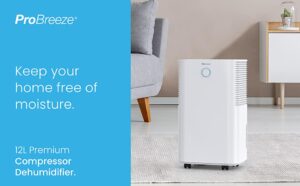 Pro Breeze 12L/Day Dehumidifier with Automatic Humidity Sensor & Display, 24 Hour Timer, Laundry Drying, Continuous Drainage and Sleep Mode for Damp, Mould and Condensatio