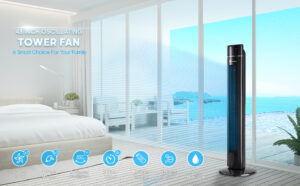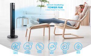 12-Hour Timer Function The 12-hour timer with flexible 1 hour increments can be controlled both on the fan itself, and with the included remote control. Allowing peace of mind and lower energy costs. 4 Wind Modes & 3 Speed Settings The PureMate 38 Inch tower fan features 3-speed setting- Low, Medium & High whilst also featuring 4 modes- Normal, Natural, Sleeping wind and Child mode for your comfort and preference. Refreshing Display With the large and clear display, you can be sure to set the your desired settings with ease. Allowing you to enjoy the cooling breeze from the comfort of your chair. Slim Line Design The sleek and sophisticated design, allow this fan to fit in to any room and décor. Allowing you to enjoy the summertime comfortably in any room. Portable & Lightweight A convenient carry handle makes it easy to take the fan to provide cool air wherever you need. This is also a useful space for storing the remote control when not in use. Remote Control A user-friendly remote gives you full control over the fan’s functions even from across the room, which is perfect for changing the settings from your bed or sofa. Oscillation Mode With 70-degrees of automatic oscillation, the tower fan provides a high-powered flow of cool air across a widespread area of your room. Height 43 INCH 38 INCH 31 INCH Colour Black Black White Digital ✓ ✓ Remote Control ✓ ✓ Oscillate ✓ ✓ ✓ Ioniser ✓ Aroma Function ✓ ✓ Dimensions 31.5 x 31.5 x 109 cm 32 X 32 X 97 cm 29 x 29 x 77.5 cm Check Offer Price Weight: 3.38 kg Dimensions: 99.6 x 20.4 x 18.2 cm; 3.38 Kilograms Brand: PureMate Model: 01