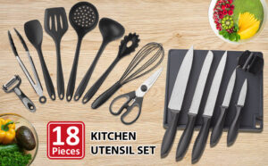 Kitchen Knife Sets with Block and Knives,18 Pieces Set with 7pcs Silicone Cooking Utensils Holder Set, 5pcs Stainless Steel Chef Knives with Scissors – Knife Sharpener-Chopping Board