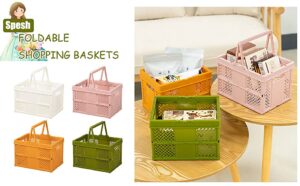 Spesh 2 Pcs Collapsible Storage Crates Foldable Shopping Baskets with Handles Small Folding Plastic Box for Picnic,Shopping,Camping(White+Pink)