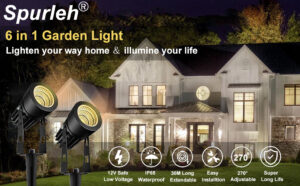 Specification: Output Voltage: 12V LED Type: COB Power:3W*6 Luminous Flux: 1800LM Cable Length: 5M*6 Color Temperature: 2700-3000K Warm White CRI:Ra>80 IP Rating:IP65 waterproof 1. Not need to spend more for this! Spurleh 6 in 1 garden lights set including adapter and Stakes; Unlike other products, Spurleh spotlights set including 98.4ft Ultra-Long Cable,meet your needs.You can place it flexibly on wherever you want. Do not need to buy other accessories. 2. Safe Low Voltage & Energy-saving 12V safe working low voltage lighting system, energy saving and long lifespan; Spurleh LED landscape light outdoor landscape spotlights with spike stand can be used year-round! 3. Excellent Quality Rugged rust-proof aluminum metal casing, IP65 waterproof design makes our outdoor spotlights can withstand strong water spray, and various extreme terrible weather. Package Including : 6 * Spot lights 6 x Metal Ground Nail 6 x Knobs 1 * Adapter 1 * User manual COB LED Chip Spurleh 6 in 1 garden lights adopts enhanced COB LED chips(CRI ≥80)and each led light offers 300 lumens of output, a total output of 1800 lumens, much brighter and stable than solar garden lights. Die-cast Aluminum Body Durable and rugged die casting material, with UV proof powder coating to resist all weather conditions. Fast heat dissipation, perfectly protect the lamp body, and thus ensure these outdoor spotlights a long lifespan of 50000H. 12V Safe Low Voltage DC 12V, very safe for humans or animal. Other high voltage garden lights may cause safety issue. Plug & play feature can save you a lot of time and money. Check Offer Price Weight: 1.59 kg Dimensions: 28.1 x 18.7 x 8.8 cm; 1.59 Kilograms Brand: Spurleh Batteries Required: No Manufacture: Spurleh