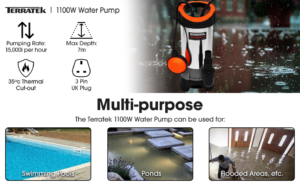 Terratek 1100W Stainless Steel Submersible Water Pump, Suitable for Pumping Dirty Water, Great for Swimming Pools, Flooded Cellars, Large Ponds & More