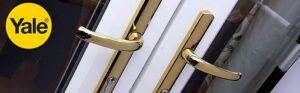 Yale P-PVC-RH-PGF Front Door Handle, Standard Security, 92mm Centre, Adjustable Fixing Points, Built In Cylinder Guard, For PVCu Doors, Gold Finish