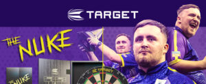 Target Darts Luke Littler Cabinet & Dartboard Set | Player Edition ‘The Nuke’ Dart Board Cupboard Set with 2 Sets of Steel Tip Darts, Score Charts, Competition Standard Throw Line