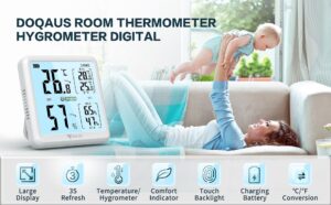 DOQAUS Room Thermometer Indoor, Digital Humidity Temperature Monitor Gauge Indicator with Touch Backlight, Max/Min Records, Rechargeble Hygrometers with Large Screen for Nursery Greenhouse Home Office