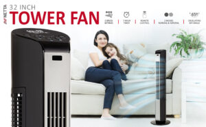 NETTA Tower Fan with Remote Control, 32 Inch Oscillating, 3 Speed Settings With 7 Hours Timer, Bladeless Floor Fan for Bedroom Living Rooms Kitchen Home Office – Black
