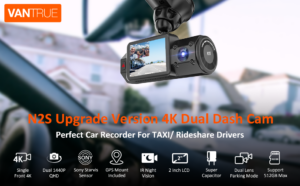 Why You Need a VANTRUE N2Pro Dual Channel 1080P Front and Inside Dash Cam? Multifunctional & Valuable: DUAL LENS for record both front and inside the car; HIGHER RESOLUTION than other similar dash cam on the market; 4IR LED lights; 24HOURS PARKING MODE for both cameras; SUPPORT 256GB MAX SD card ; OPTIONAL GPS function; LOOP RECORDING, G-SENSOR, TIME LAPSE. Stunning Video Quality: The front camera equipped with higher performance image sensor, make it record crystal clear footage at 2560x1440P/ 30fps or 1920x1080P/ 60fps while under single front camera recording mode, capturing license plates clear. Brilliant IR Night Vision: The cabin camera equipped with 4 infrared LED Lights, while turn on IR Light, the cabin camera will record at black and white in order to capture clear video even in darkness. Greatly protect you and passenger from any accidents dispute. Monitor Car Condition For 24 Hours: Under parking mode, compare to most of other dual dash cam only detect motion in front of the car. VANTRUE N2pro will automatic start record simultaneously once the front or interior camera detects any motion. Provide double protection for your car safety. Larger Memory Capacity: Support up to 256GB Max memory card, provide enough space for a long time tour recording. Record every happy moment on the road. Optional GPS Function: If need more detail data of your driving, please buy an extra N2Pro GPS Mount(ASIN:B01J5KZLQS). Help you to track your driving route, speed(KM/H or MP/H), time via VANTRUE Player. Regular firmware updates to ensure improved features and functionality for maximum quality. You can always improve the performance of your N2 Pro and view the benefits of the numerous new features and functions with latest firmware update. Strict quality control and have a professional QC team, with CE, FCC & RoHS certificated. Single Front 2.5K Recording / 1080P 60FPS You can record with the single front facing camera If you don’t need the inside recordings, the advanced OV4689 sensor and F1.8 front lens ensures it to capture crystal-clear videos of the road and license plate at: 2560x1440P/ 30fps, 2304x1296P/ 30fps, 1920x1080P/ 30fps. If you require for higher speed record, it can switch to resolution at 1920x1080P/ 60fps, help to capture more coverage details evidence in accident, let you feel easy on the way. Front 170° + Cabin 140° Wide Angle With a 170° front facing OV4689 sensor camera and 140° rear facing sony sensor camera(80° rotatable) in one body, N2 pro dual dashcams for cars front and rear shots both front and inside the cabin simutaneously in full hd 1920x1080P 30fps, perfect dual lens dash cameras for cars, taxis, Uber, rideshare, lyft drivers, commuters, and families, provides drivers and passengers with optimum protection. Taxi Dash Cam with Voice Recorded Built in micphone and speaker to capture high quality audio clear without distortion. Don’t want to record voice? Just one press to turn the micphone off. It’s important to protect you and prove your right when driving at night with passenger. 24hs Parking Monitor Monitor your car situation all day and night. After engine switch off and turn on parking mode, once the front or cabin camera detects any movement,the dual dash cam will automatic start record simultaneously. Provide double protection for your car safety. For 24 hours parking mode, please keep connect with external power source or Hardwire it (N2Pro hardwire kit Asin: B07GKS9V36) G-sensor and Loop Recording The dual dash cam for cars will automatically locks the important video segments to the “Event” folder when it detected the bumped, hit, collision etc thanks to the Gravity sensor. Also you can press the P button to lock the current video to protect a clip from overwriting. Auto Starts up and records when the ignition sparks up, loop recording saves the latest the videos and overwrites the oldest videos when card reaches capacity. Time Lapse Car Camera Time lapse function automatically takes photos at specified intervals and edit them together to a video clip so they can play much faster than real time. With this function on, you can record movements, changes, or events that take place over a long period of time, or just captures frames for a time lapse video of a multi-week road trip, greatly saved space on your memory card. Support 256GB Max memory card, recommend Vantrue SD Card ( Asin: B081VCYCLM ). Dual Dash Camera with Optional GPS Optional GPS function help you to track the driving route, location and speed in either KM/H or MP/H. Help to record more detail evidence for incident. To use GPS function, please buy an extra N2 Pro GPS mount to use it (ASIN: B01J5KZLQS). 80° Ratatable Cabin Camera N2Pro inside camera equipped with 140° wide angle, design on 80°rotatable, you can adjust it to a suitable angle for the location you would need for coverage record, fit for different car windscreen of different angle. Convenient for you to record anything important you require. Working temperature is -20 to 70°C. Ideal for any climate, which can resist more heat and cold damage to the dash camera. Besides, N2Pro Dual channel car dashboard camera will auto shut down when it is over heat, protects itself & car. Ensure you’re on safe driving on the road. Easy Installation & Compact Design The N2pro dash camera can fits nicely with the supply suction cup mount, remains firmly on the windscreen, it’s easy to lock the dash cam with a ball joint and screw clamp, ensure it’s stable if you drive on bumpy road. It’s compact size make it easy to hidden behind the rear view mirror, without obstruct your driving view. You can either use a cigarette light for power and it’s simple to set up and mounting. N2pro Dual 1080P Dash Cam Warm Tips Recommend Vantrue microSD Card(not included). DON’T use Sandisk Card. Please format SD card on your camera directly before using. Please keep the dash cam connect with power source when use it. What’s in the box?
