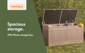 VonHaus 270L Garden Storage Box – Outdoor Utility Chest Organiser – Weatherproof Plastic, Lockable Lid, Sliding Bar Hinge, Carry Handles – for Patio, Decking, Balcony – Grey and Black