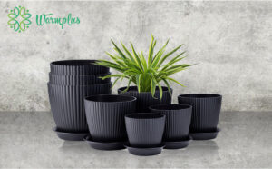Warmplus 8 Pack Plant Pots Indoor, 19/17.5/16.5/16/14/13/11.5/10cm Stripe Grooves Plastic Flower Pots with Drainage Holes and Tray, Modern Decorative Planter Pot for All House Plants, Black