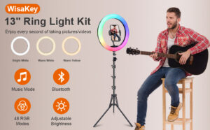 WisaKey 13″ LED Ring Light with 63″ Tripod Stand & Phone Holder, Selfie Ring Light with 3 Color temperatures and 12 Dimmable Brightness, 48 RGB Modes, Fill light for TikTok, YouTube, Live Streaming