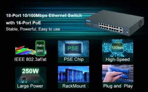 YuanLey 18 Port PoE Switch, 16 PoE+ Port 100Mbps, 2 Uplink Gigabit, 250W Built-in Power, 802.3af/at, Rackmount Unmanaged Plug and Play
